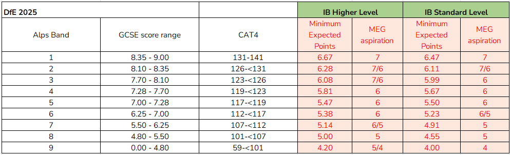 2025 IB - Summary of MEPs and MEGs with CAT4 or GCSE Prior Attainment bandings